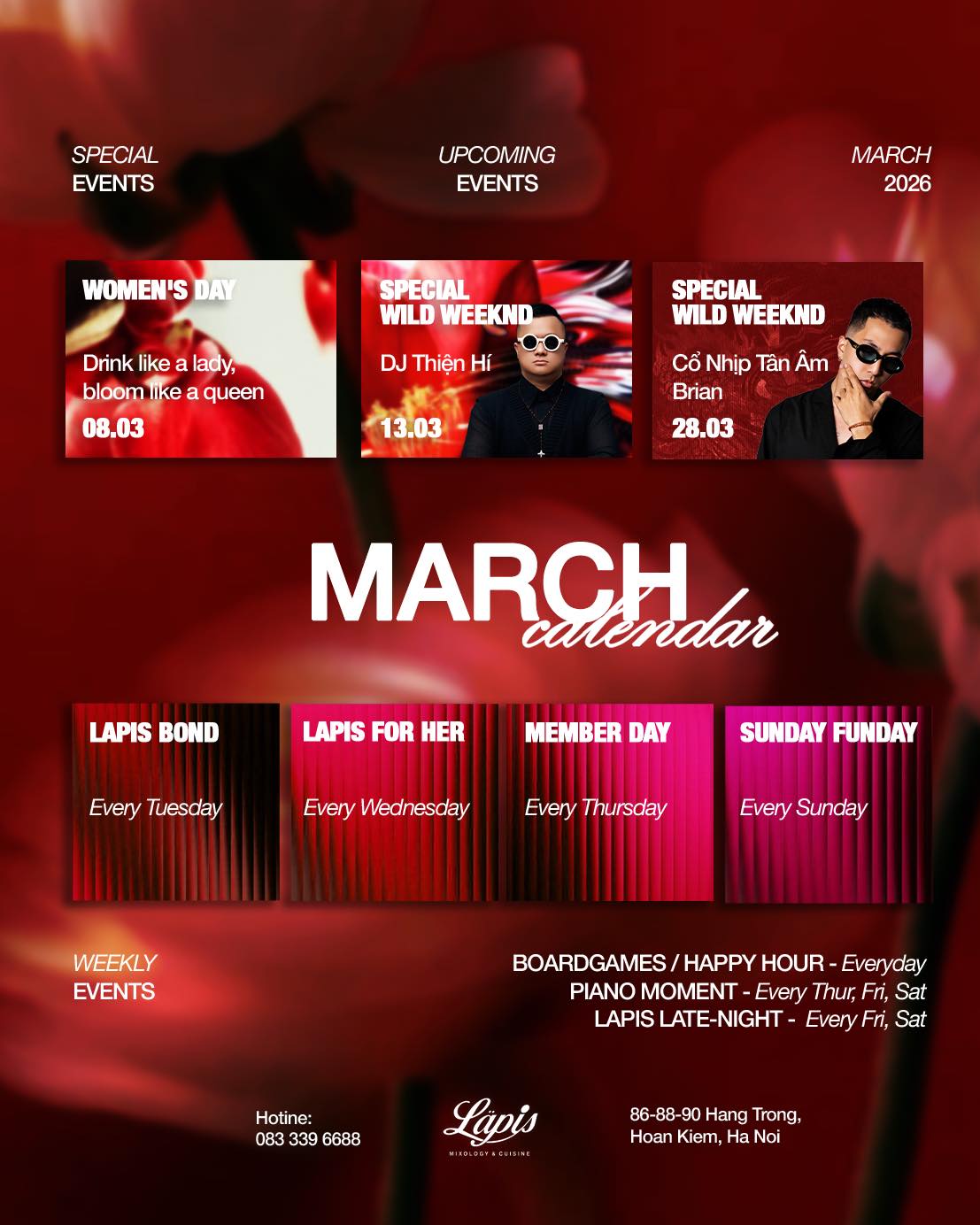 Bên cạnh đó, tháng 3 còn có các sự kiện nổi bật như Special Wild Weekend (13.03) với DJ Thiện Hí và 28.03 với Guest DJ Brian, cùng những trải nghiệm quen thuộc như LÄPIS Bond (Tuesday), LÄPIS For Her (Wednesday), Member Day (Thursday) và Sunday Funday.